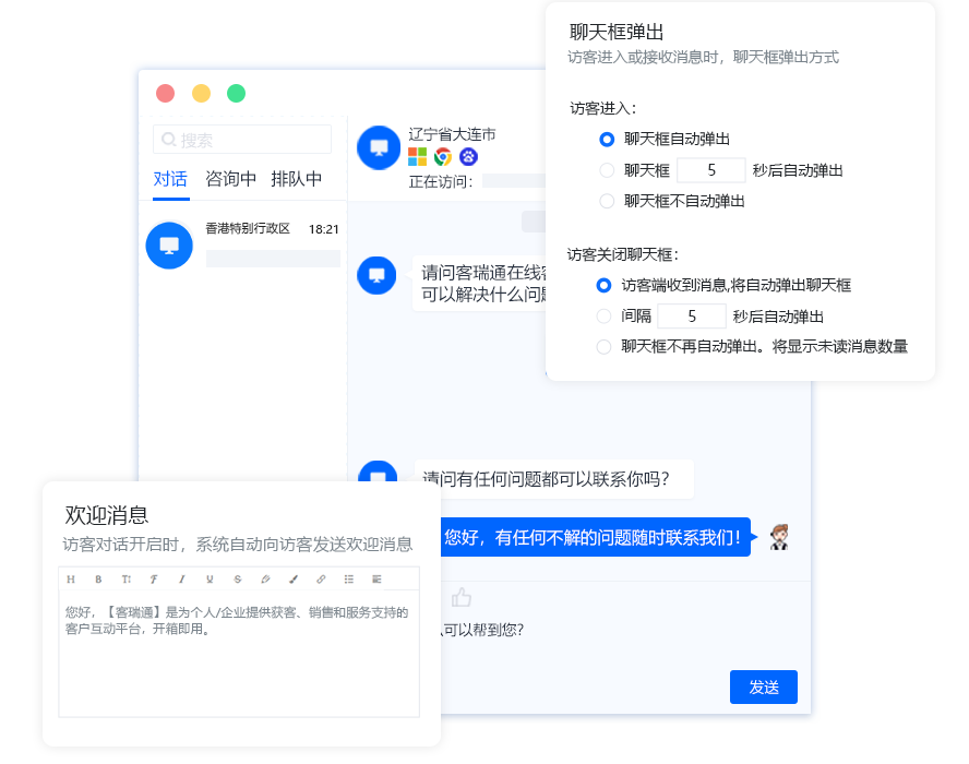 丰富的外观和功能自定义,通过后台外观设置,可修改对话窗口颜色,样式,支持单个和组合模式的风格样式。